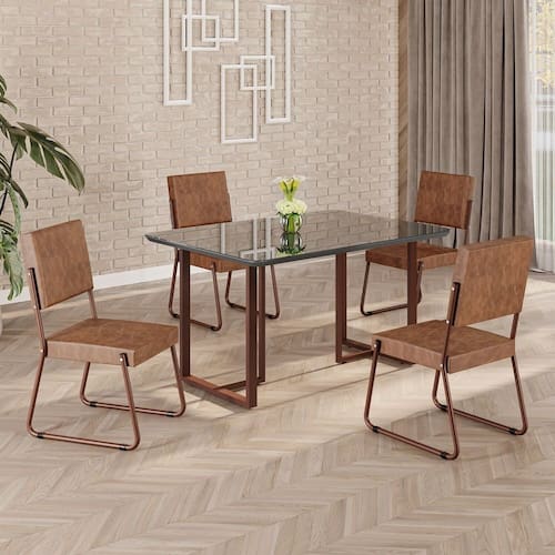 Este conjunto de mesa retangular e 4 cadeiras oferece estilo e praticidade. Com estrutura tubular em aço para estabilidade, o tampo em MDF Laca grafite com vidro adiciona sofisticação e resistência a riscos e manchas. As cadeiras combinam harmoniosamente com a mesa, garantindo conforto com estofamento. Ideal para diversos espaços, é perfeito para receber convidados ou desfrutar de refeições em família, criando um ambiente acolhedor e elegante. Medida da Mesa (A x L x P): 77,5cm x 120cm x 90cm Peso da Mesa: 37,2 kg Mesa suporta até: 10 kg Acabamento da Cadeira/Banco: Pintura Texturizada Acabamento da Mesa: Laca Ambiente Principal: Sala de Jantar Cadeira/Banco estofada: Encosto e Assento Estofados Cadeira/Banco suporta até: 120 kg Complexidade da Montagem: Baixa: pode ser montado por uma pessoa sozinha Cor: Marrom Cor do Produto: Marrom Cor Secundária: Marrom De Canto (Canto Alemão): Não Enchimento do Assento: Espuma D-26 Escala de Brilho: Semi-Fosco Espessura do Tampo: 25 mm Estrutura do Assento: MDF, Eucalipto, espuma e Couro ecológico. Formato do Tampo: Retangular Itens Inclusos: 1 Mesa, 4 Cadeiras, Manual De Montagem E Ferragens. Linha ou Coleção: Napoli Manual de Montagem e Instalação: https://cdn2.madeiramadeira.com.br/atributo/moveis-teixeira/2170278-5246-17218529860483.pdf Material da Base da Mesa: Aço Material da Estrutura da Cadeira: Aço Material do Tampo: MDF/Vidro Medida da Cadeira/Banco (A x L x P): 94cm x 47,5cm x 59cm Medida do Tampo (L x C x E): 90cm x 120cm x 2,5cm Mesa Extensível: Não Necessita Montagem: Sim Origem do Produto: Nacional Peso da Cadeira/Banco: 7,06 kg Possui Apoio Para os Pés: Não Quantidade de Lugares: 04 Recomendações de Uso, Manutenção e Limpeza: Usar um pano de tecido macio e seco, evitar detergentes, alvejantes e produtos químicos de limpeza; no tampo usar tecido macio levemente umedecido. Revestimento da Cadeira/Banco: Couro Ecológico Sistema de Montagem: Parafusos