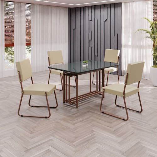 Este conjunto de mesa retangular e 4 cadeiras oferece estilo e praticidade. Com estrutura tubular em aço para estabilidade, o tampo em MDF Laca grafite com vidro adiciona sofisticação e resistência a riscos e manchas. As cadeiras combinam harmoniosamente com a mesa, garantindo conforto com estofamento. Ideal para diversos espaços, é perfeito para receber convidados ou desfrutar de refeições em família, criando um ambiente acolhedor e elegante.