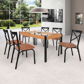 O conjunto de mesa Karina, é o conjunto ideal para sua cozinha, na cor preto fosco e com tampo de vidro de 140cm x 80cm, possui 6 cadeiras com desing moderno e anatômico, estofado em tecido linho ideal para seu ambiente. Medida da Mesa (A x L x P): 77cmx140cmx80cm Peso da Mesa: 34,73 kg Mesa suporta até: 10 kg Acabamento da Cadeira/Banco: Pintura Epóxi Acabamento da Mesa: Pintura Epóxi Almofada do assento: Removível Ambiente Principal: Cozinha Cadeira/Banco estofada: Sim Cadeira/Banco suporta até: 100 kg codigo_ean: 7900288210296 Complexidade da Montagem: Baixa: pode ser montado por uma pessoa sozinha Cor: Preto fosco / Caramelo Cor do Produto: Preto Fosco / Caramelo Enchimento do Assento: Espuma D-20 Escala de Brilho: Fosco Espessura do Tampo: 8 mm Itens Inclusos: 1 Mesa, 6 Cadeiras, Kit Ferragens e Manual de Montagem Linha ou Coleção: Karina Manual de Montagem e Instalação: https://product-hub-prd.madeiramadeira.com.br/996976583/documents/363cc71e-c9e3-4f77-a1d1-2ab3246b519db4ae0b8a43e3f8a71754510219.pdf Marca: Ciplafe Material da Base da Mesa: Madeira e ferro Material da Estrutura da Cadeira: Aço Carbono Material do Tampo: Vidro Medida da Cadeira/Banco (A x L x P): 90cmx50cmx53cm Medida do Tampo (L x C x E): 80cmx140cmx0,8cm Necessita Montagem: Sim Origem do Produto: Nacional Peso da Cadeira/Banco: 4,25 kg Possui Apoio Para os Pés: Não Quantidade de Cadeiras: 6 Quantidade de Lugares: 06 Recomendações de Uso, Manutenção e Limpeza: Limpar com pano levemente umedecido. Não usar produtos abrasivos que possam danificar a superfície do móvel. Revestimento da Cadeira/Banco: Courino Sistema de Montagem: Parafusos Vidro Temperado: Não