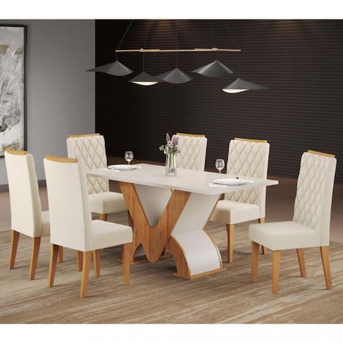 A Sala de Jantar Lunar com 6 Cadeiras Iza é a opção ideal para quem quer preencher o espaço para as refeições e não abre mão de conforto. Seu tamanho é adequado às casas brasileiras, se encaixando perfeitamente na cozinha ou na sala de jantar.