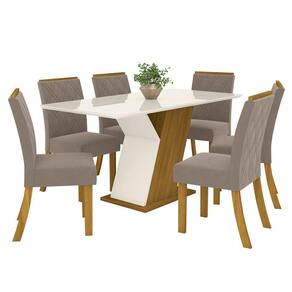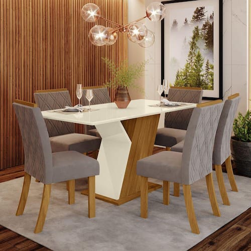 Linha: Lupita Quantidade de Lugares: 06 Lugares Escala Brilho da Cadeira: Fosco Medida Cadeira (A x L x P): 95 cm x 44 cm x 57,5 cm Altura Assento até o chão: 45,5 cm Peso Suportado por Cadeira: 120 Kg Estrutura Assento: MDP/MDF Enchimento Assento: Espuma D23 Estrutura Encosto: MDP/MDF Revestimento Encosto e Assento: Tecido Suede Enchimento Encosto: Espuma D15 Acabamento Base Mesa: Pintura UV Texturizada Fosca Acabamento Tampo Mesa: Pintura UV Brilhante Medida Mesa (A x L x P): 80 cm x 160 cm x 80 cm Mesa Suporta Até: 40 Kg Formato Tampo: Retangular Material Mesa: Tampo em MDF e Base em MDP. Medida Tampo (L x C x E): 80 cm x 160 cm x 2,5 cm Possui Vidro: Sim Vidro Temperado: Não Tamanho do Vidro (L x C x E): 80 cm x 160 cm x 4 mm