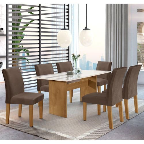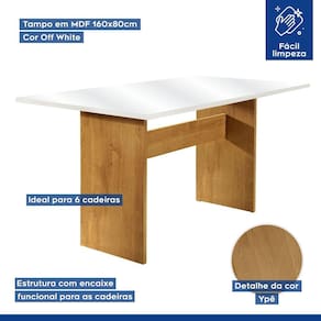 Se você pretende completar a sua casa com bom gosto e charme, então veja que mimo este lindo Conjunto de Mesa e Cadeiras. Não é uma excelente forma de começar? Super charmoso, ele é perfeito para que você dê um visual fancy e moderno para o seu lar. Medida da Mesa (A x L x P): 79,5x160x80cm Peso da Mesa: 43 Mesa suporta até: 40 Acabamento da Cadeira/Banco: Pintura UV Acabamento da Mesa: Pintura UV Almofada do assento: Fixa Altura do Conjunto: Ambiente Principal: Sala de Jantar Apoio para Braços Estofado: Cadeira/Banco estofada: Encosto e Assento Estofados Cadeira/Banco suporta até: 120 Complexidade da Montagem: Alta: deve ser montado por um montador especializado Cor: Ypê/Marrom Cor da Base: Cor do Produto: Ypê/Marrom Cor do Tampo: Cor Flex: Cor Secundária: Bege De Canto (Canto Alemão): Não Design da Base: Enchimento do Assento: Espuma D-23 Enchimento do Encosto: Espuma D-20 Escala de Brilho: Fosco Espessura do Tampo: 22 Espessura do Vidro: Estrutura do Assento: MDF Estrutura do Encosto: MDF Formato do Tampo: Retangular Informações Complementares: Itens Inclusos: 1 Mesa, 6 Cadeiras, Kit Ferragens e Manual de Montagem Linha ou Coleção: Espanha Manual de Especificação Técnica: Manual de Montagem e Instalação: https://cdn2.madeiramadeira.com.br/atributo/cel-moveis/939636-534239-conjuntosaladejantarmesatampodevidro6cadeirasespanhayescasaype.pdf Material da Base da Mesa: MDF Material da Estrutura da Cadeira: MDF Material do Tampo: Vidro/MDF Medida da Base (A x L x P): 77,3x89x40cm Medida da Cadeira/Banco (A x L x P): 95x44x56cm Medida do Canto Alemão (A x L x P): Medida do Suporte Giratório (L x C x E): Medida do Tampo (L x C x E): 160x80x2,2cm Mesa Extensível: Não Montagem Flex: Necessita Montagem: Sim Origem do Produto: Nacional Peso da Cadeira/Banco: 7.5 Possui Apoio para Braços: Não Possui Apoio Para os Pés: Não Possui Suporte Giratório: Não Quantidade de Lugares: 06 Recomendações de Uso, Manutenção e Limpeza: Limpeza com pano macio e levemente umedecido. Não utilizar solventes a base e de inflamáveis. Não utilizar produtos abrasivos. Revestimento da Cadeira/Banco: Suede Sistema de Montagem: Parafusos e Minifix. Tipo de Madeira Maciça da Base da Mesa: Tipo de Madeira Maciça do Tampo: Vidro Temperado: Sim