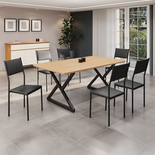 Este conjunto de mesa retangular e 6 cadeiras oferece estilo e praticidade. Com estrutura tubular em aço para estabilidade, o tampo em MDF cinamomo adiciona sofisticação e resistência a riscos e manchas. As cadeiras combinam harmoniosamente com a mesa, garantindo conforto com estofamento. Ideal para diversos espaços, é perfeito para receber convidados ou desfrutar de refeições em família, criando um ambiente acolhedor e elegante. Medida da Mesa (A x L x P): 77cm x 160cm x 90cm Peso da Mesa: 27,71 kg Mesa suporta até: 10.0000 Acabamento da Cadeira/Banco: Pintura Texturizada Acabamento da Mesa: Melamínico Ambiente Principal: Sala de Jantar Cadeira/Banco estofada: Encosto e Assento Estofados Cadeira/Banco Estofada: Encosto e Assento Estofados Cadeira/Banco suporta até: 120.0000 codigo_ean: 7909903962862 Complexidade da Montagem: Baixa: pode ser montado por uma pessoa sozinha Cor: Preto Cor do Produto: Preto De Canto (Canto Alemão): Não Enchimento do Assento: Espuma D-12 Escala de Brilho: Semi-Fosco Espessura do Tampo: 20 mm Formato do Tampo: Retangular Itens Inclusos: 1 Mesa, 6 Cadeiras, Manual De Montagem E Ferragens. Manual de Montagem e Instalação: https://product-hub-prd.madeiramadeira.com.br/925833/documents/b5ff1ec1-d666-4c79-801e-1ac0d1fa6ebc2165358493817217652913828.pdf Material da Base da Mesa: Aço Material da Estrutura da Cadeira: Aço Material do Tampo: MDF Medida da Cadeira/Banco (A x L x P): 90,5cm x 44,5cm x 49cm Medida do Tampo (L x C x E): 90cm x 160cm x 2cm Mesa Extensível: Não Necessita Montagem: Sim Origem do Produto: Nacional Peso da Cadeira/Banco: 4,74 kg Possui Apoio Para os Pés: Não Quantidade de Lugares: 06 Recomendações de Uso, Manutenção e Limpeza: Usar um pano de tecido macio e seco, evitar detergentes, alvejantes e produtos químicos de limpeza; no tampo usar tecido macio levemente umedecido. Revestimento da Cadeira/Banco: Couro Ecológico Sistema de Montagem: Parafusos