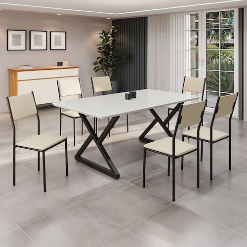 Este conjunto de mesa retangular e 6 cadeiras oferece estilo e praticidade. Com estrutura tubular em aço para estabilidade, o tampo em Mdf Laca off white com vidro adiciona sofisticação e resistência a riscos e manchas. As cadeiras combinam harmoniosamente com a mesa, garantindo conforto com estofamento. Ideal para diversos espaços, é perfeito para receber convidados ou desfrutar de refeições em família, criando um ambiente acolhedor e elegante.