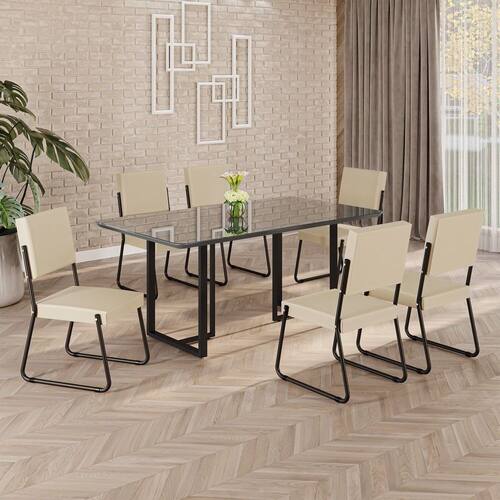 Este conjunto de mesa retangular e 6 cadeiras oferece estilo e praticidade. Com estrutura tubular em aço para estabilidade, o tampo em MDF Laca grafite com vidro adiciona sofisticação e resistência a riscos e manchas. As cadeiras combinam harmoniosamente com a mesa, garantindo conforto com estofamento. Ideal para diversos espaços, é perfeito para receber convidados ou desfrutar de refeições em família, criando um ambiente acolhedor e elegante. Medida da Mesa (A x L x P): 77,5cm x 160cm x 90cm Peso da Mesa: 47,8 kg Mesa suporta até: 10 kg Acabamento da Cadeira/Banco: Pintura Texturizada Acabamento da Mesa: Melamínico Ambiente Principal: Sala de Jantar Cadeira/Banco estofada: Encosto e Assento Estofados Cadeira/Banco suporta até: 120 kg Complexidade da Montagem: Baixa: pode ser montado por uma pessoa sozinha Cor: Creme / Preto Cor do Produto: Creme / Preto Cor Secundária: Bege De Canto (Canto Alemão): Não Enchimento do Assento: Espuma D-26 Escala de Brilho: Semi-Fosco Espessura do Tampo: 25 mm Estrutura do Assento: MDF, Eucalipto, espuma e Couro ecológico. Formato do Tampo: Retangular Itens Inclusos: 1 Mesa, 6 Cadeiras, Manual De Montagem E Ferragens. Linha ou Coleção: Napoli Manual de Montagem e Instalação: https://cdn2.madeiramadeira.com.br/atributo/moveis-teixeira/2170493-4938-1721906798378.pdf Material da Base da Mesa: Aço Material da Estrutura da Cadeira: Aço Material do Tampo: MDF/Vidro Medida da Cadeira/Banco (A x L x P): 94cm x 47,5cm x 59cm Medida do Tampo (L x C x E): 90cm x 160cm x 2,5cm Mesa Extensível: Não Necessita Montagem: Sim Origem do Produto: Nacional Peso da Cadeira/Banco: 7,06 kg Possui Apoio Para os Pés: Não Quantidade de Lugares: 06 Recomendações de Uso, Manutenção e Limpeza: Usar um pano de tecido macio e seco, evitar detergentes, alvejantes e produtos químicos de limpeza; no tampo usar tecido macio levemente umedecido. Revestimento da Cadeira/Banco: Couro Ecológico Sistema de Montagem: Parafusos