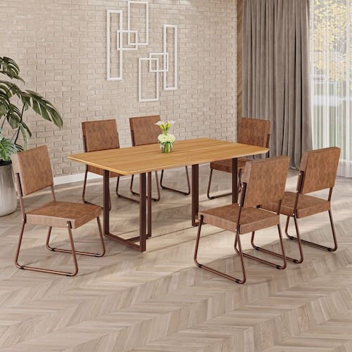 Este conjunto de mesa retangular e 6 cadeiras oferece estilo e praticidade. Com estrutura tubular em aço para estabilidade, o tampo em MDF cinamomo adiciona sofisticação e resistência a riscos e manchas. As cadeiras combinam harmoniosamente com a mesa, garantindo conforto com estofamento. Ideal para diversos espaços, é perfeito para receber convidados ou desfrutar de refeições em família, criando um ambiente acolhedor e elegante. Medida da Mesa (A x L x P): 77cm x 160cm x 90cm Peso da Mesa: 24,8 kg Mesa suporta até: 10 kg Acabamento da Cadeira/Banco: Pintura Texturizada Acabamento da Mesa: Melamínico Ambiente Principal: Sala de Jantar Cadeira/Banco estofada: Encosto e Assento Estofados Cadeira/Banco suporta até: 120 kg Complexidade da Montagem: Baixa: pode ser montado por uma pessoa sozinha Cor: Marrom Cor do Produto: Marrom Cor Secundária: Marrom De Canto (Canto Alemão): Não Enchimento do Assento: Espuma D-26 Escala de Brilho: Semi-Fosco Espessura do Tampo: 20 mm Estrutura do Assento: MDF, Eucalipto, espuma e Couro ecológico. Formato do Tampo: Retangular Itens Inclusos: 1 Mesa, 6 Cadeiras, Manual De Montagem E Ferragens. Linha ou Coleção: Napoli Manual de Montagem e Instalação: https://cdn2.madeiramadeira.com.br/atributo/moveis-teixeira/2170493-4938-1721906798378.pdf Material da Base da Mesa: Aço Material da Estrutura da Cadeira: Aço Material do Tampo: MDF Medida da Cadeira/Banco (A x L x P): 94cm x 47,5cm x 59cm Medida do Tampo (L x C x E): 90cm x 160cm x 2cm Mesa Extensível: Não Necessita Montagem: Sim Origem do Produto: Nacional Peso da Cadeira/Banco: 7,06 kg Possui Apoio Para os Pés: Não Quantidade de Lugares: 06 Recomendações de Uso, Manutenção e Limpeza: Usar um pano de tecido macio e seco, evitar detergentes, alvejantes e produtos químicos de limpeza; no tampo usar tecido macio levemente umedecido. Revestimento da Cadeira/Banco: Couro Ecológico Sistema de Montagem: Parafusos