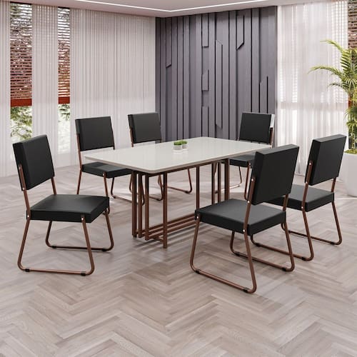 Este conjunto de mesa retangular e 6 cadeiras oferece estilo e praticidade. Com estrutura tubular em aço para estabilidade, o tampo em MDF Laca off white com vidro adiciona sofisticação e resistência a riscos e manchas. As cadeiras combinam harmoniosamente com a mesa, garantindo conforto com estofamento. Ideal para diversos espaços, é perfeito para receber convidados ou desfrutar de refeições em família, criando um ambiente acolhedor e elegante.