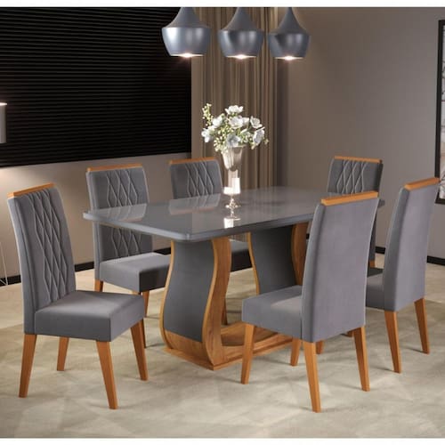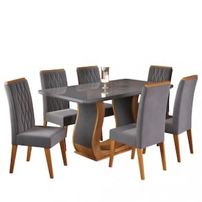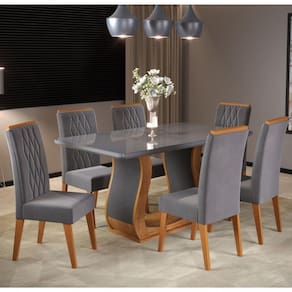 Características: Estrutura da mesa em MDP Tampo retangular em MDF 40mm e vidro temperado 4mm Tampo suporta até 50kg distribuídos 6 Cadeiras Estrutura da cadeira: madeira de Eucalipto Encosto em MDF e espuma D12 Assento em espuma D20 Cada cadeira suporta até 90kg Revestimento das cadeiras em tecido veludo Acabamento em pintura UV, semi-brilho