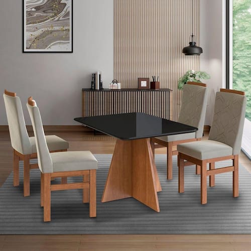 Mesas e Cadeiras são indispensáveis para o funcionamento da casa e é no cômodo de confraternização que elas ganham protagonismo. Composto por peças de muito charme, o conjunto de Mesa e Cadeiras ref:150/26 produzida em madeira maciça orna o uso desse móvel importante com mesas para 4 lugares para garantir uma usabilidade plena para o seu dia a dia. Ideal para cozinhas e salas de jantar, o kit oferece amplo espaço para que você possa dispor pratos, copos, talheres e até uma travessa com o quitute da vez, enquanto acomoda os convidados com aconchego e receptividade. Ah, para completar, é só combiná-la com o restante da mobília de sua preferência e criar o ambiente intimista perfeito para a sua rotina ou reuniões entre amigos. Medida da Mesa (A x L x P): 120x90x80 Peso da Mesa: 40 Mesa suporta até: 80 Acabamento da Cadeira/Banco: Pintura UV Acabamento da Mesa: Pintura UV Acompanha Manual de Instalação: Sim Almofada do assento: Fixa Almofada do encosto: Fixa Altura do Conjunto: 80 Ambiente Principal: Sala de Jantar Cadeira/Banco estofada: Encosto e Assento Estofados Cadeira/Banco suporta até: 120 Complexidade da Montagem: Baixa: pode ser montado por uma pessoa sozinha Cor: Cenela/Preto/Creme Cor da Base: Marrom Cor do Produto: Cenela/Preto/Creme Cor do Tampo: Preto Cor Flex: Cenela/Preto/Creme Cor Secundária: Bege De Canto (Canto Alemão): Não Design da Base: Trapézio Enchimento do Assento: Espuma D-23 Enchimento do Encosto: Espuma D-14 Escala de Brilho: Semi-Brilho Espessura do Tampo: 30 Espessura do Vidro: mm Estrutura do Assento: HDF 12 Estrutura do Encosto: HDF 4 Formato do Tampo: Retangular Informações Complementares: Conjunto mesa com 4 cadeiras madeira maciça Itens Inclusos: 01 Tampo, 01 Base, 4 Cadeiras, Kit Ferragens, 01 Manual Linha ou Coleção: 2024 Manual de Especificação Técnica: https://product-hub-prd.madeiramadeira.com.br/883070/documents/c25b4ea1-485c-436a-903f-50f20c6c28081700450cadeira26.pdf Manual de Montagem e Instalação: https://product-hub-prd.madeiramadeira.com.br/883070/documents/dca2d528-8e15-42fe-80e5-ff4659aa84bb1700449manualref150.pdf Material da Base da Mesa: MDP Material da Estrutura da Cadeira: Madeira Maciça Material do Tampo: Vidro/MDF Material Principal: Vidro/MDP/MDF/Madeira Maciça Material Principal das Cadeiras/Bancos: Madeira Maciça Medida da Base (A x L x P): 75X67X41 CM Medida da Cadeira/Banco (A x L x P): 104X44X48 Medida do Tampo (L x C x E): 120X90X3 Mesa Dobrável: Não Mesa Extensível: Não Montagem Flex: Apenas conforme segue manual Necessita Montagem: Sim Origem do Produto: Nacional Peso da Cadeira/Banco: 9 Possui Apoio para Braços: Não Possui Apoio Para os Pés: Não Possui Prateleiras: Não Possui Rodízio: Não Possui Suporte Giratório: Não Possui Vidro: Sim Quantidade de Cadeiras: 4 Quantidade de Lugares: 04 Recomendações de Uso, Manutenção e Limpeza: Limpeza com pano macio e levemente umedecido Revestimento da Cadeira/Banco: Suede Sistema de Montagem: Parafusos, Cantoneiras, Tapa Furo e Cola Tipo de Assento: Fixo Tipo de Encosto: Estofado Vidro Temperado: Não