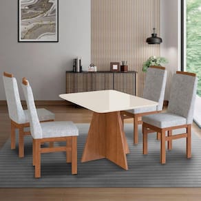 Mesas e Cadeiras são indispensáveis para o funcionamento da casa e é no cômodo de confraternização que elas ganham protagonismo. Composto por peças de muito charme, o conjunto de Mesa e Cadeiras ref:150/26 produzida em madeira maciça orna o uso desse móvel importante com mesas para 4 lugares para garantir uma usabilidade plena para o seu dia a dia. Ideal para cozinhas e salas de jantar, o kit oferece amplo espaço para que você possa dispor pratos, copos, talheres e até uma travessa com o quitute da vez, enquanto acomoda os convidados com aconchego e receptividade. Ah, para completar, é só combiná-la com o restante da mobília de sua preferência e criar o ambiente intimista perfeito para a sua rotina ou reuniões entre amigos. Medida da Mesa (A x L x P): 120x90x80 Peso da Mesa: 40 Mesa suporta até: 80 Acabamento da Cadeira/Banco: Pintura UV Acabamento da Mesa: Pintura UV Acompanha Manual de Instalação: Sim Almofada do assento: Fixa Almofada do encosto: Fixa Altura do Conjunto: 80 Ambiente Principal: Sala de Jantar Cadeira/Banco estofada: Encosto e Assento Estofados Cadeira/Banco suporta até: 120 Complexidade da Montagem: Baixa: pode ser montado por uma pessoa sozinha Cor: Canela/Cinza/Off White Cor da Base: Marrom Cor do Produto: Canela/Cinza/Off White Cor do Tampo: Off White Cor Flex: Canela/Linho 02 Cor Secundária: Marrom De Canto (Canto Alemão): Não Design da Base: Trapézio Enchimento do Assento: Espuma D-14 Enchimento do Encosto: Espuma D-12 Escala de Brilho: Semi-Brilho Espessura do Tampo: 30 Espessura do Vidro: mm Estrutura do Assento: HDF 12 Estrutura do Encosto: HDF 4 Formato do Tampo: Retangular Informações Complementares: Conjunto mesa com 4 cadeiras madeira maciça Itens Inclusos: 01 Tampo, 01 Base, 4 Cadeiras, Kit Ferragens, 01 Manual Linha ou Coleção: 2024 Manual de Especificação Técnica: https://product-hub-prd.madeiramadeira.com.br/880962/documents/8cd628ee-31b5-4bc6-92a8-886b38e691b81674185manualref150.pdf Manual de Montagem e Instalação: https://product-hub-prd.madeiramadeira.com.br/880962/documents/383bbae8-03b9-4c93-8d07-7eead97dc2a41674184cadeira26.pdf Material da Base da Mesa: MDP Material da Estrutura da Cadeira: Madeira Maciça Material do Tampo: Vidro/MDF Material Principal: MDF/MDP/Madeira Maciça/Vidro Material Principal das Cadeiras/Bancos: Madeira Maciça Medida da Base (A x L x P): 75X67X41 CM Medida da Cadeira/Banco (A x L x P): 104X44X48 Medida do Tampo (L x C x E): 120X90X3 Mesa Dobrável: Não Mesa Extensível: Não Montagem Flex: Apenas conforme segue manual Necessita Montagem: Sim Origem do Produto: Nacional Peso da Cadeira/Banco: 9 Possui Apoio para Braços: Não Possui Apoio Para os Pés: Não Possui Prateleiras: Não Possui Rodízio: Não Possui Suporte Giratório: Não Possui Vidro: Sim Quantidade de Cadeiras: 4 Quantidade de Lugares: 04 Recomendações de Uso, Manutenção e Limpeza: Limpeza com pano macio e levemente umedecido Revestimento da Cadeira/Banco: Linho Sistema de Montagem: Parafusos, Cantoneiras, Tapa Furo e Cola Tipo de Assento: Fixo Tipo de Encosto: Estofado Vidro Temperado: Não
