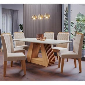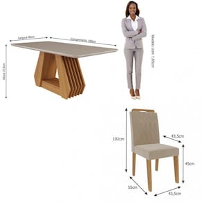 A sala de jantar Agata com 1,80x0,90m e 6 cadeiras Paola é uma excelente opção para reunir a família em momentos especiais. A mesa Agata destaca-se por sua base triangular e tampo em MDF/vidro com bordas chanfradas e acabamento em laca, combinando elegância e modernidade. As cadeiras Paola são uma fusão de estilo, conforto e funcionalidade, com estrutura de madeira que oferece durabilidade e um toque rústico sofisticado. O estofamento de alta qualidade garante conforto, e o sistema de fácil montagem das cadeiras torna o conjunto ainda mais funcional.
