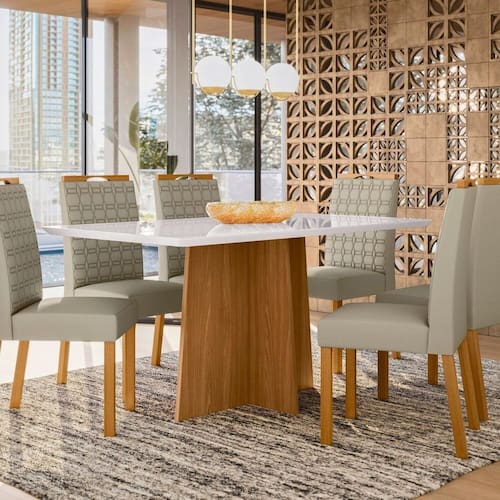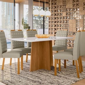 Belíssima Mesa Anitta, vai levar charme e beleza para sua casa. Produzido com material de alta qualidade proporciona mais resistência e durabilidade. Possuí pés diferenciados com design moderno e elegante, além do encaixe ideal para as cadeiras se acomodarem perfeitamente, ajudando a otimizar seu espaço. Medida da Mesa (A x L x P): 80cmX160cmX90cm Peso da Mesa: 57,9 kg Mesa suporta até: 20.0000 Acabamento da Cadeira/Banco: Pintura UV Acabamento da Mesa: Pintura UV Ambiente Principal: Sala de Jantar Cadeira/Banco Estofada: Encosto e Assento Estofados Cadeira/Banco estofada: Encosto e Assento Estofados Cadeira/Banco suporta até: 120.0000 codigo_ean: 7900288113597 Complexidade da Montagem: Média: pode ser montado por mais de uma pessoa e/ou necessite de maior conhecimento para montagem Cor: Off White Cor do Produto: Off White Cor do Tampo: Off White Cor Secundária: Bege De Canto (Canto Alemão): Não Enchimento do Assento: Espuma D-18 Escala de Brilho: Semi-Brilho Espessura do Tampo: 28 mm Formato do Tampo: Retangular Informações Complementares: cor do tecido assento (Ja01) VELUDO NUDE Itens Inclusos: 1 Mesa, 6 Cadeiras Manual de Montagem e Kit Ferragens Manual de Montagem e Instalação: https://product-hub-prd.madeiramadeira.com.br/992136/documents/5f36f9ba-cb92-45e5-84bd-b77d28d939a42808235291317440759079659.pdf Marca: New Ceval Móveis Material da Base da Mesa: MDF Material da Estrutura da Cadeira: Madeira Material do Tampo: Vidro/MDF Medida da Cadeira/Banco (A x L x P): 98cmX43cmX57cm Medida do Tampo (L x C x E): 160cmX90cmX25cm Mesa Dobrável: Não Mesa Extensível: Não Necessita Montagem: Sim Origem do Produto: Nacional Peso da Cadeira/Banco: 6,3 kg Possui Apoio para Braços: Não Possui Apoio Para os Pés: Não Possui Suporte Giratório: Não Quantidade de Cadeiras: 6 Quantidade de Lugares: 06 Recomendações de Uso, Manutenção e Limpeza: Limpar com flanela limpa e seca. Não molhar o móvel e não expor em lugar úmido ou próximo de fontes de calor, não usar produtos abrasivos. Revestimento da Cadeira/Banco: Poliéster Sistema de Montagem: Parafusos, cavilhas e minifix
