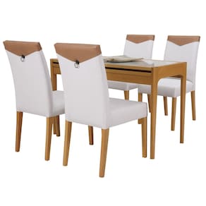 Esse é o conjunto perfeito para ambientes menores, a Mesa Aparador Extensível possui 53cm fechada e aberta chegando a 106cm, produzida em madeira maciça de Tauari e tampo de vidro Cinza Claro, 4mm colado. As cadeiras estofadas em espuma densidade 23, tecido papel 54% algodão e 46% poliéster, produzida também em madeira maciça de Tauari, seu encosto com detalhe em sintético e um puxador.