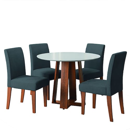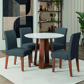 MEDIDAS: Medidas Mesa: [ A ] = 80 cm [ L ] = 103 cm [ P ] = 103 cm Medidas Cadeiras (Cada): [ A ] = 92 cm [ L ] = 42 cm [ P ] = 60 cm PESO MESA: 21,60 Kg PESO CADEIRA: 7,30 Kg (Cada) PESO SUPORTADO MESA: 25 Kg (Distribuídos) PESO SUPORTADO CADEIRA: 110 Kg cada MODELO: Conjunto de Mesa Athenas Redonda para Sala de Jantar 1,03m com 4 Cadeiras Trieste MARCA: Dobuê COR DA MESA: Estrutura: Madeirado / Tampo: Off White COR DA CADEIRA: Estrutura: Madeirado / Assento: Grafite ESTRUTURA: MDF ACABAMENTO MESA: Verniz vítreo ACABAMENTO CADEIRA: Veluplus TECIDO DA CADEIRA: Veluplus REVESTIMENTO ASSENTO E ENCOSTO DA CADEIRA: Espuma D20 MATERIAL DO TAMPO: MDF PÉS DA CADEIRA: Sapatas Plásticas DIFERENCIAL: Material em MDF de alta resistência, cadeiras com assento e encosto acolchoados, tecido veluplus. SISTEMA DE MONTAGEM: Parafusos e porcas cilíndricas ITENS INCLUSOS: 1 Mesa e 4 cadeiras, 1 manual de montagem e 1 kit parafusos INSTRUÇÕES E CUIDADOS: Limpar com pano levemente umedecido com água, não utilizar produtos abrasivos GARANTIA: 3 meses pelo fabricante