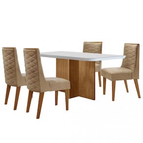 Características: Estrutura em MDF Tampo com vidro temperado Vidro 4mm 4 Cadeiras Cada cadeira suporta até 120 kg Revestimento com tecido linho
