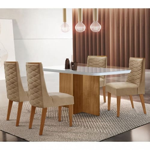 Características: Estrutura em MDF Tampo com vidro temperado Vidro 4mm 4 Cadeiras Cada cadeira suporta até 120 kg Revestimento com tecido linho