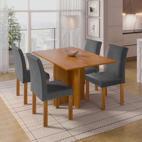 A mesa é resistente para o dia a dia? Sim, é firme e suporta bem o uso frequente. Medida da Mesa (A x L x P): 79cmx100cmx80cm Peso da Mesa: 20 kg Mesa suporta até: 40 kg Acabamento da Cadeira/Banco: Pintura Acabamento da Mesa: Pintura UV Acompanha Manual de Instalação: Sim Almofada do assento: Fixa Ambiente Principal: Sala de Jantar Cadeira/Banco estofada: Encosto e Assento Estofados Cadeira/Banco Estofada: Encosto e Assento Estofados Cadeira/Banco suporta até: 120 kg Cadeira/Banco Suporta Até: 120.0000 codigo_ean: 7900288228468 Complexidade da Montagem: Média: pode ser montado por mais de uma pessoa e/ou necessite de maior conhecimento para montagem Cor: Cinamomo/Cinza Cor do Produto: Cinamomo/Cinza Cor Secundária: Cinza De Canto (Canto Alemão): Não Enchimento do Assento: Espuma D-23 Enchimento do Encosto: Espuma D-20 Escala de Brilho: Fosco Espessura do Tampo: 18 mm Estrutura do Assento: MDF Formato do Tampo: Retangular Itens Inclusos: 1 Mesa, 4 Cadeiras, Kit Ferragens e Manual de Montagem Linha ou Coleção: Dakota /Espanha/Carol Manual de Montagem e Instalação: https://product-hub-prd.madeiramadeira.com.br/200491405/documents/6b9362a6-c251-46fc-a916-b6a5837fb286313658373217551982188397.pdf Marca: Cel Móveis Material da Base da Mesa: MDF Material da Estrutura da Cadeira: MDF/MDP Material do Tampo: MDF Material Principal: MDF Material Principal das Cadeiras/Bancos: MDF/MDP Medida da Cadeira/Banco (A x L x P): 98,5cmx44cmx56cm Medida do Tampo (L x C x E): 100cmx80cmx18mm Mesa Dobrável: Não Mesa Extensível: Não Necessita Montagem: Sim Origem do Produto: Nacional Peso da Cadeira/Banco: 9,1 kg Possui Apoio Para os Pés: Não Possui Vidro: Não Quantidade de Cadeiras: 4 Quantidade de Lugares: 04 Recomendações de Uso, Manutenção e Limpeza: Limpar com pano macio e levemente umedecido. Não utilizar solventes a base e de inflamáveis. Não utilizar produtos abrasivos. Revestimento da Cadeira/Banco: Veludo Sistema de Montagem: Parafusos. Tipo de Assento: Fixo Tipo de Encosto: Fixo