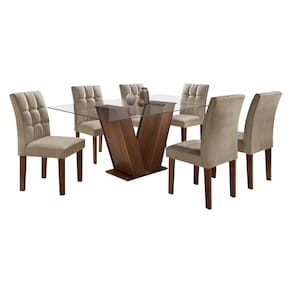 Deixe seu lar repleto de charme e bom gosto com este Conjunto de Mesa Classic com 6 Cadeiras Vitória. Ideal para deixar sua Sala de Jantar muito mais convidativa e melhor decorada, ela é composta por móveis de qualidade e muita resistência. Medida da Mesa (A x L x P): 79,3cmx160cmx80cm Peso da Mesa: 39 kg Mesa suporta até: 40 kg Acabamento da Cadeira/Banco: Pintura UV Acabamento da Mesa: Pintura UV Almofada do assento: Fixa Ambiente: Sala de Jantar Ambiente Principal: Sala de Jantar Cadeira/Banco estofada: Sim Cadeira/Banco Estofada: Encosto e Assento Estofados Cadeira/Banco suporta até: 120 kg Cadeira/Banco Suporta Até: 120 kg Complexidade da Montagem: Alta: deve ser montado por um montador especializado Cor da Base: Marrom Cor do Produto: Chocolate/Pena Cor do Tampo: Transparente Cor Secundária: Marrom De Canto (Canto Alemão): Não Design da Base: Em "V" Enchimento do Assento: Espuma D-23 Enchimento do Encosto: Espuma D-20 Escala de Brilho: Brilhante Espessura do Tampo: 8 mm Espessura do Vidro: 8 mm Estrutura do Assento: MDF Estrutura do Encosto: MDF Formato do Tampo: Retangular Itens Inclusos: 1 Mesa, 6 Cadeiras e Manual de Montagem. Linha ou Coleção: Vitória Material da Base da Mesa: MDF/MDP Material da Estrutura da Cadeira: MDF Material do Tampo: Vidro Material Principal das Cadeiras/Bancos: MDF Medida da Cadeira/Banco (A x L x P): 97,5cmx44cmx55cm Medida do Tampo (L x C x E): 160cmx80cmx0,8cm Mesa Extensível: Não Necessita Montagem: Sim Peso da Cadeira/Banco: 8,6 kg Possui Apoio Para os Pés: Não Quantidade de Lugares: 06 Recomendações de Uso, Manutenção e Limpeza: Limpeza com pano macio e levemente umedecido. Não utilizar solventes a base e de inflamáveis. Não utilizar produtos abrasivos. Resistente à Chuva: Não Revestimento da Cadeira/Banco: Veludo Sistema de Montagem: Parafuso e Minifix Vidro Temperado: Não