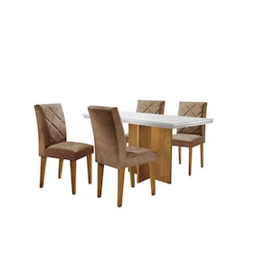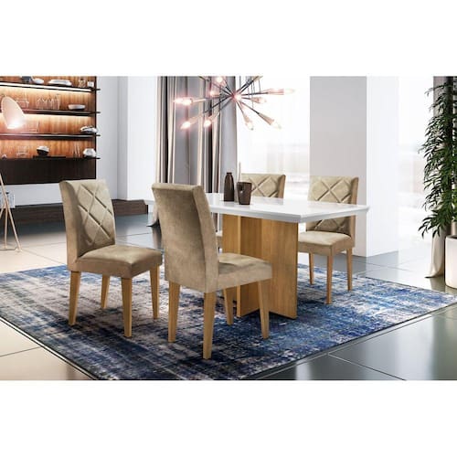 Linda mesa com tampo em MDF laqueado, produto muito resistente. A Cadeira é estofada com costura, dá um charme a mais para o conjunto. Com certeza ela deixará a sua sala de estar ainda mais linda. Você não pode perder essa oportunidade. Medida da Mesa (A x L x P): 80cm x 120cm x 80cm Peso da Mesa: 31,32 kg Mesa suporta até: 30 kg Acabamento da Cadeira/Banco: Pintura Texturizada Acabamento da Mesa: Pintura UV Almofada do assento: Fixa Ambiente Principal: Sala de Jantar Cadeira/Banco estofada: Encosto e Assento Estofados Cadeira/Banco suporta até: 90 kg Complexidade da Montagem: Média: pode ser montado por mais de uma pessoa e/ou necessite de maior conhecimento para montagem Cor: Animalle Choc. Off White/Imbuia Cor da Base: Marrom Cor do Produto: Animalle Choc. Off White/Imbuia Cor do Tampo: Bege Cor Secundária: Bege De Canto (Canto Alemão): Não Design da Base: Cruz Enchimento do Assento: Espuma D-23 Enchimento do Encosto: Espuma D-18 Escala de Brilho: Semi-Brilho Espessura do Tampo: 45 mm Estrutura do Assento: Estofado Estrutura do Encosto: Estofado Formato do Tampo: Retangular Informações Complementares: Material 100% MDF Itens Inclusos: 1 Mesa, 4 Cadeiras e Manual de Montagem. Linha ou Coleção: Cayman Manual de Especificação Técnica: https://cdn2.madeiramadeira.com.br/atributo/rufato/455364-391108-mesa-com-cadeira-bloch.pdf Manual de Montagem e Instalação: https://cdn2.madeiramadeira.com.br/atributo/rufato/455364-391108-mesa-com-cadeira-bloch.pdf Material da Base da Mesa: MDF Material da Estrutura da Cadeira: MDF Material do Tampo: MDF Medida da Base (A x L x P): 78,5cm x 68cm x 46,5cm Medida da Cadeira/Banco (A x L x P): 98cm x 42cm x 56cm Medida do Tampo (L x C x E): 120cm x 80cm x 4,5cm Mesa Extensível: Não Necessita Montagem: Sim Origem do Produto: Nacional Peso da Cadeira/Banco: 7,71 kg Possui Apoio para Braços: Não Possui Apoio Para os Pés: Não Possui Suporte Giratório: Não Quantidade de Lugares: 04 Recomendações de Uso, Manutenção e Limpeza: Limpeza com pano macio e levemente umedecido. Não utilizar solventes a base e de inflamáveis. Não utilizar produtos abrasivos. Revestimento da Cadeira/Banco: Suede Sistema de Montagem: Parafusos, Minifix e Cavilhas.