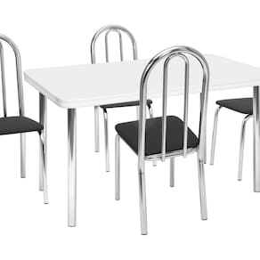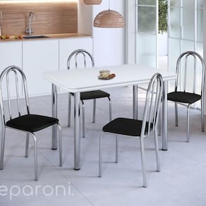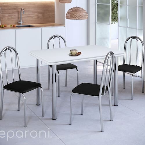 Tre Paroni Móveis, fabricante de móveis há mais de 36 anos, produzindo design com qualidade. Apresenta seu conjunto de mesa de jantar com tampo de 45 mm em MDP/BP e pés cromados, ideal para cozinha ou sala de jantar, acompanhada de 4 cadeiras cromadas revestidas em couro sintético com assento em espuma D15, proporcionando conforto e bem estar. Medida da Mesa (A x L x P): 78 cm x 120 cm x 75 cm Peso da Mesa: 18,6 kg Mesa suporta até: 60.0000 Acabamento da Cadeira/Banco: Cromado Acabamento da Mesa: Cromado Acompanha Manual de Instalação: Sim Almofada do assento: Fixa Ambiente Principal: Cozinha Cadeira/Banco estofada: Somente Assento Estofado Cadeira/Banco Estofada: Somente Assento Estofado Cadeira/Banco suporta até: 110.0000 codigo_ean: 7909903961285 Complexidade da Montagem: Baixa: pode ser montado por uma pessoa sozinha Cor: Cromado/Branco/Preto Cor do Produto: Cromado/Branco/Preto Cor Flex: Não De Canto (Canto Alemão): Não Design da Base: 4 Pés Escala de Brilho: Brilhante Espessura do Tampo: 45 mm Estrutura do Assento: Aglomerado Estrutura do Encosto: Aço cromado Formato do Tampo: Retangular Itens Inclusos: 1 Mesa, 4 Cadeiras e Manual de Montagem Manual de Montagem e Instalação: https://product-hub-prd.madeiramadeira.com.br/956400/documents/820b97de-dc7f-496d-8058-97dd10789968241983349251727986358805.pdf Material da Base da Mesa: Aço Cromado Material da Estrutura da Cadeira: Aço Material do Tampo: MDP Material Principal: Aço Cromado Material Principal das Cadeiras/Bancos: Aço Medida da Base (A x L x P): 78 cm x 120 cm x 75 cm Medida da Cadeira/Banco (A x L x P): 92 cm x 38 cm x 45 cm Medida do Tampo (L x C x E): 120 cm x 75 cm x 4,5 cm Mesa Dobrável: Não Mesa Extensível: Não Montagem Flex: Não Necessita Montagem: Sim Origem do Produto: Nacional Peso da Cadeira/Banco: 4,5 kg Possui Apoio para Braços: Não Possui Apoio Para os Pés: Não Possui Prateleiras: Não Possui Suporte Giratório: Não Possui Vidro: Não Quantidade de Cadeiras: 4 Quantidade de Lugares: 04 Recomendações de Uso, Manutenção e Limpeza: Deve ser feita com pano macio e seco ou levemente umedecido com água e sabão neutro. Não devem ser utilizados abrasivos como palha de aço e objetos cortantes. Sistema de Montagem: Parafusos e Minifix Tipo de Assento: Fixo Tipo de Encosto: Fixo