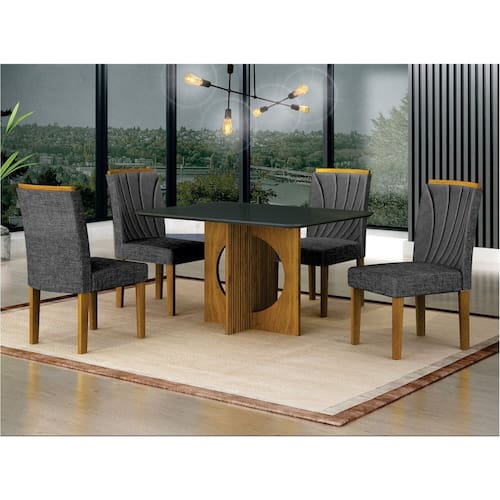 Base com design moderno, compacta, ideal para quem tem espaço físico reduzido, as cadeiras se encaixam perfeitamente na mesa. Cadeiras com detalhe bordado no encosto.