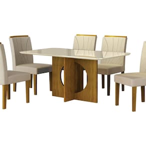 Quer deixar sua sala ainda mais linda? Aposte no Conjunto Sala de Jantar 06 cadeiras Lorena, a mesa possui tampo de 160cm com vidro e cadeiras com assento e encosto estofados.