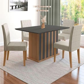 Com design contemporâneo, a Mesa de Jantar Amália é perfeita para completar sua cozinha. Possui base retangular que traz mais robustez com detalhes em chapa de madeira MDP ripada na parte frontal, tampo 136x90cm em MDP 25mm ideal para 4 lugares, com bordas chanfradas que valorizam o produto deixando o modelo ainda mais requintado. As sapatas plásticas garantem melhor durabilidade e estabilidade. Acabamento em pintura UV, disponível em padrões amadeirados com perfeita combinação com os mais variados ambientes.Seu conjunto de cadeiras em MDF com encosto e assento esfofados traz o conforto que você precisa.