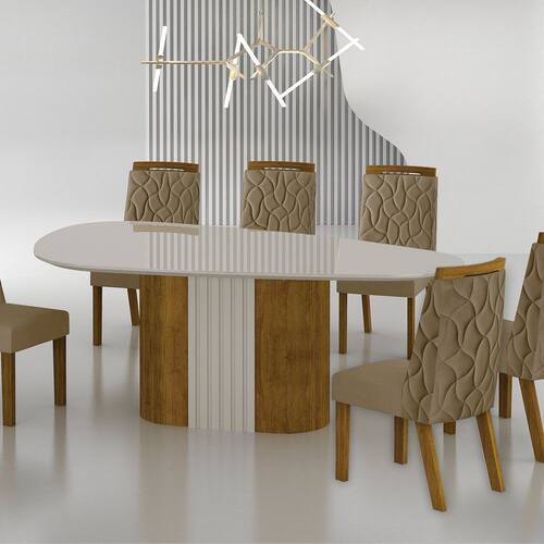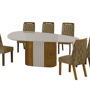 Conjunto sala de jantar mesa Dacota 2,00 m tampo orgânico com vidro, 06 cadeiras Dacota com assento e encosto estofados, detalhe da base ripado, dimensões da mesa: Altura: 750 mm Largura 1000 mm, comprimento: 2000 mm, com esse conjunto de sala de jantar sua sala irá ficar ainda mais linda e elegante. Medida da Mesa (A x L x P): 75x100x200 Peso da Mesa: 76,4 kg Mesa suporta até: 25.0000 Acabamento da Cadeira/Banco: Pintura UV Acabamento da Mesa: Pintura UV Ambiente Principal: Sala de Jantar Cadeira/Banco estofada: Encosto e Assento Estofados Cadeira/Banco Estofada: Encosto e Assento Estofados Cadeira/Banco suporta até: 120.0000 codigo_ean: 7900288100535 Complexidade da Montagem: Média: pode ser montado por mais de uma pessoa e/ou necessite de maior conhecimento para montagem Cor: Freijó/Camurça Cor do Produto: Freijo/Camurça Cor Secundária: Marrom De Canto (Canto Alemão): Não Enchimento do Assento: Espuma D-20 Escala de Brilho: Fosco Espessura do Tampo: 25 mm Estrutura do Assento: MDF Formato do Tampo: Oval Itens Inclusos: 1 Mesa, 6 Cadeiras, Kit Ferragens, 1 Manual de Montagem. Manual de Montagem e Instalação: https://product-hub-prd.madeiramadeira.com.br/983105/documents/dc1c6b7b-7f99-46ad-9446-0d52a1283501276464888017429906467408.pdf Marca: Leifer Material da Base da Mesa: MDF Material da Estrutura da Cadeira: MDF Material do Tampo: MDF Material Principal: MDF Medida da Cadeira/Banco (A x L x P): 97,5x44x59 Medida do Tampo (L x C x E): 100x200x75 Mesa Extensível: Não Necessita Montagem: Sim Origem do Produto: Nacional Peso da Cadeira/Banco: 9,1 kg Possui Apoio Para os Pés: Não Quantidade de Cadeiras: 6 Quantidade de Lugares: 06 Recomendações de Uso, Manutenção e Limpeza: Limpar com pano úmido, quase seco. Revestimento da Cadeira/Banco: Veludo Sistema de Montagem: Parafusos