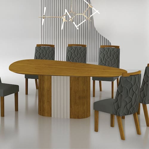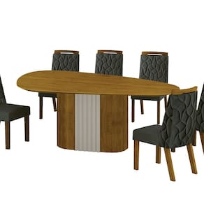 Conjunto sala de jantar mesa Dacota 2,00 m tampo orgânico sem vidro, 06 cadeiras Dacota com assento e encosto estofados, detalhe da base ripado, dimensões da mesa: Altura: 750 mm Largura 1000 mm, comprimento: 2000 mm, com esse conjunto de sala de jantar sua sala irá ficar ainda mais linda e elegante. Medida da Mesa (A x L x P): 75x100x200 Peso da Mesa: 60,4 kg Mesa suporta até: 25.0000 Acabamento da Cadeira/Banco: Pintura UV Acabamento da Mesa: Pintura UV Ambiente Principal: Sala de Jantar Cadeira/Banco estofada: Encosto e Assento Estofados Cadeira/Banco Estofada: Encosto e Assento Estofados Cadeira/Banco suporta até: 120.0000 codigo_ean: 7900288100771 Complexidade da Montagem: Média: pode ser montado por mais de uma pessoa e/ou necessite de maior conhecimento para montagem Cor: Freijo/Off/Freijo/cinza Cor do Produto: Freijo/Off/Freijo/cinza Cor Secundária: Marrom De Canto (Canto Alemão): Não Enchimento do Assento: Espuma D-20 Escala de Brilho: Fosco Espessura do Tampo: 25 mm Estrutura do Assento: MDF Formato do Tampo: Oval Itens Inclusos: 1 Mesa + 6 Cadeiras + Kit Ferragens + 1 Manual de Montagem. Manual de Montagem e Instalação: https://product-hub-prd.madeiramadeira.com.br/983119/documents/602ae177-57de-4775-952b-9d61de4a3845276464888017429906467408.pdf Marca: Leifer Material da Base da Mesa: MDF Material da Estrutura da Cadeira: MDF Material do Tampo: MDF Material Principal: MDF Medida da Cadeira/Banco (A x L x P): 97,5x44x59 Medida do Tampo (L x C x E): 100x200x75 Mesa Extensível: Não Necessita Montagem: Sim Origem do Produto: Nacional Peso da Cadeira/Banco: 9,1 kg Possui Apoio Para os Pés: Não Quantidade de Cadeiras: 6 Quantidade de Lugares: 06 Recomendações de Uso, Manutenção e Limpeza: Limpar com pano úmido, quase seco. Revestimento da Cadeira/Banco: Veludo Sistema de Montagem: Parafusos