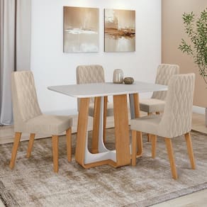 Conjunto Sala de Jantar Mesa Easy Pop 120x80cm Tampo Vidro/MDF com 4 Cadeiras Seat Linho Rinzai Bege Amendoa Clean/off White Design Moderno, Conforto e Sofisticação para o seu Lar.
