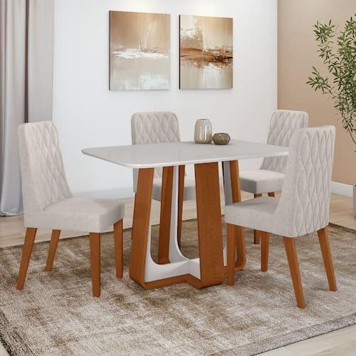 As cadeiras que acompanham o conjunto aliam conforto e sofisticação. Estofadas com espuma D-20 no assento e D-18 no encosto, oferecem uma experiência confortável em todas as refeições. A estrutura em MDF e MDP com pés reforçados garante estabilidade e resistência, suportando até 100kg. O detalhe das sapatas em PVC protege o piso e aumenta a durabilidade. Disponíveis no tecido Linho, as cadeiras se adaptam facilmente a qualquer estilo de decoração. Cantos curvos, com desing moderno, maior e fácil de combinar, ideal para quem busca bom gosto e pde.