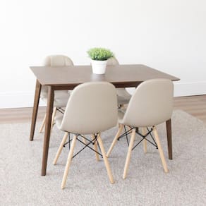 A Mesa Finlândia em madeira cor Nogueira é ideal para quem busca elegância e sobriedade, com muita praticidade! Seu design rústico garante o detalhe que falta na decoração da sua casa. O conjunto com 4 cadeiras Eiffel Botonê completa o kit e garante o custo benefício para transformar o estilo divertido da sua casa com muita praticidade e toques de design. Conjunto composto por: uma Mesa com tampo em MDF de 19 mm, base em madeira seringueira + 4 cadeiras com assento revestido em PU, base em madeira faia com armação em aço pintado. Possui Rodízio: Não Altura do Conjunto: 82 cm Ambiente: null Ambiente Principal: Sala de Jantar Cor: Nude Informação Complementar: 1x Mesa de Jantar Retangular Tampo MDF Finlândia NogueiraLargura: 120 cmAltura: 75 cmPeso: 19 kgProfundidade: 75 cmNecessita Montagem: Sim1x Kit 4 Cadeiras Botonê Eiffel NudeLargura: 45Altura: 82Peso: 4.1Profundidade: 50Necessita Montagem: Sim Tamanho: