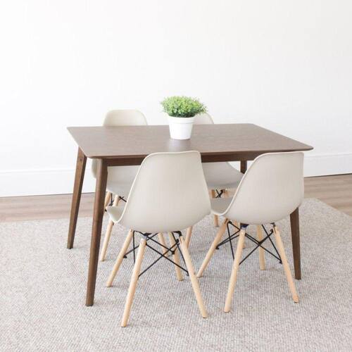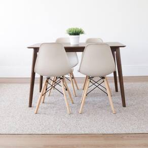 A Mesa Finlândia em madeira é ideal para quem busca elegância e praticidade, seu design rústico garante o detalhe que falta na decoração da sua casa. O conjunto com 4 cadeiras Eiffel completa o kit e garante o custo benefício para transformar o estilo divertido da sua casa com muita praticidade e toques de design. Conjunto composto por: uma Mesa com tampo em MDF de 19 mm, base em madeira seringueira + 4 cadeiras com assento em PP e base em madeira e aço pintado. Possui Rodízio: Não Altura do Conjunto: 81.5 cm Ambiente: null Ambiente Principal: Sala de Jantar Cor: Nude Informação Complementar: 1x Mesa de Jantar Retangular Tampo MDF Finlândia NogueiraLargura: 120 cmAltura: 75 cmPeso: 19 kgProfundidade: 75 cmNecessita Montagem: Sim1x Conjunto 4 Cadeiras Eiffel PP Base Madeira Desmontada NudeLargura: 46 cmAltura: 81,5 cmPeso: 3,5 kgProfundidade: 51,5 cmNecessita Montagem: Sim Tamanho: