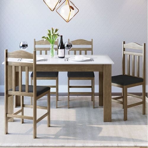 Conjunto Mesa Fixa com 04 Cadeira 200, CJE11200 da Móveis Canção. Conjunto confeccionado em MDP e cadeiras de madeira de alta qualidade, com estofamento proporcionando mais conforto. Acabamento em pintura UV. Este conjunto vai deixar sua sala de jantar mais elegante e moderna. Possui Portas: Não Altura do Conjunto: 98 cm Ambiente: null Ambiente Principal: Sala de Jantar Cor: Ameixa Negra Informação Complementar: 1x Mesa para Sala de Jantar Fixa 1200x780 Ameixa Negra/Branco Largura: 120 cm Altura: 75 cm Peso: 16 kg Profundidade: 78 cm Necessita Montagem: Sim