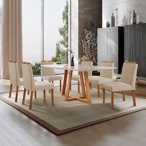 Escala de Brilho: Semi-Brilho Cor Predominante: Mel Encosto e Assento Estofados, Revestidos em Veludo ou Linho Enchimento do Assento: Espuma D-20 Medida da Mesa (A x L x P): 78 X 180 X 90 cm Medida da Base (A x L x P): 75 X 60 X 100 cm Medida do Tampo (L x C x E): 96 X 183 X 2,8 cm Medida da Cadeira/Banco (A x L x P): 94 X 46 X 55 cm Material da Base da Mesa: MDF/Madeira Maciça Tipo de Madeira Maciça da Base da Mesa: Eucalipto Tratado Imunizado e seco em Estufa Peso da Cadeira: 8,5 Kg Cadeira Suporta Até 120 Kg Acabamento da Cadeira: Verniz Natural Material da Estrutura da Cadeira: MDF/Madeira Maciça Cor do Tampo: Off White Cor da Base: Mel Enchimento do Encosto: Espuma D-14 Almofada do Assento: Fixa Estrutura do Assento: MDF 6mm/Espuma 40mm Peso da Mesa: 56,5 Kg Acabamento da Mesa: Verniz Natural Mesa Suporta Até 30 Kg Formato do Tampo: Retângular Material do Tampo: Vidro 3mm/MDF 25mm