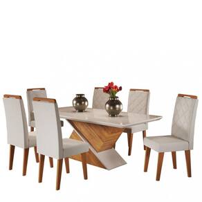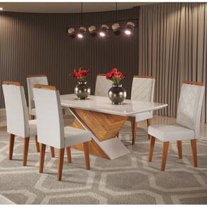 Características: Estrutura da mesa em MDP Tampo retangular em MDF 40mm e vidro 4mm Tampo suporta até 50kg distribuídos 6 Cadeiras em madeira de Eucalipto Encosto em MDF e espuma D12 Assento em MDF e espuma D20 Cada cadeira suporta até 90kg Revestimento das cadeiras em tecido Veludo Acabamento em pintura UV, semi-brilho