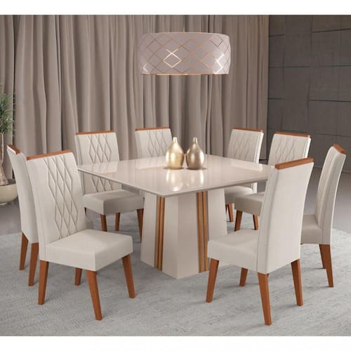 Características: Estrutura da mesa em MDP Tampo quadrado em MDF 40mm e vidro temperado 4mm Tampo suporta até 50kg distribuídos 8 Cadeiras Estrutura da cadeira: madeira de Eucalipto Encosto em MDF e espuma D12 Assento em espuma D20 Cada cadeira suporta até 90kg Revestimento das cadeiras em tecido veludo Acabamento em pintura UV, semi-brilho