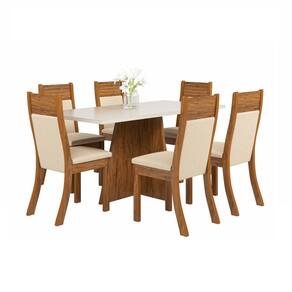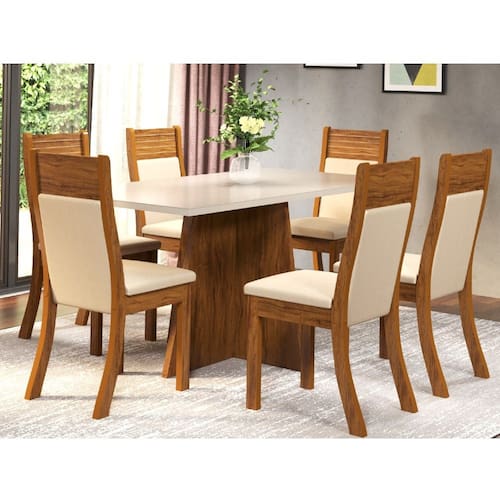 Características Material da mesa MDP Tampo MDP 25mm Material da cadeira MDP/MDF Acabamento Semi Brilho Pintura UV 6 Cadeiras Tecido em Veludo Cadeira suporta até 90 Kg Mesa suporta até 120 Kg