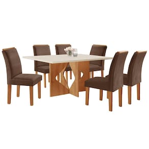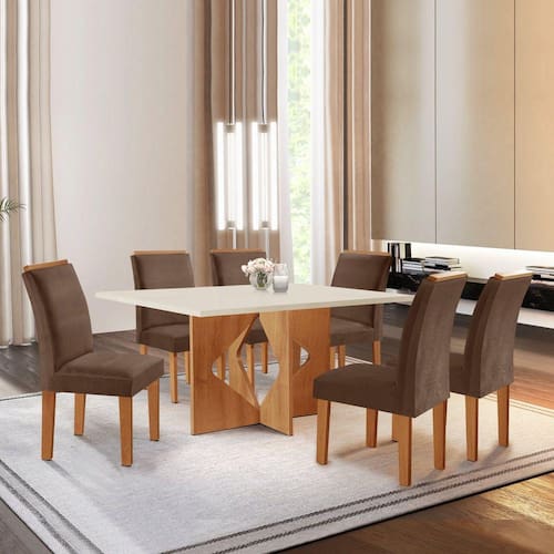 Na hora de receber visitas para refeições em casa você não quer se preocupar com mais nada além do cardápio, certo? Então para ter certeza de que seus convidados se sentirão bem recepcionados invista no Conjunto de Mesa de Jantar Laura, um kit completo e com tudo o que você precisa para um evento perfeito: 6 cadeiras aconchegantes, tampo amplo e um design de encher os olhos. Além do visual moderno, a combinação de cores forma ainda um móvel daqueles dignos de muitos elogios e que será palco para ótimos momentos. Medida da Mesa (A x L x P): 79cmx160cmx80cm Peso da Mesa: 37.8 Mesa suporta até: 30 Acabamento da Cadeira/Banco: Pintura Acabamento da Mesa: Pintura UV Almofada do assento: Fixa Altura do Conjunto: Ambiente Principal: Sala de Jantar Apoio para Braços Estofado: Cadeira/Banco estofada: Encosto e Assento Estofados Cadeira/Banco suporta até: 120 Complexidade da Montagem: Média: pode ser montado por mais de uma pessoa e/ou necessite de maior conhecimento para montagem Cor: Cinamomo/Off White/Suede Animale Cor da Base: Cor do Produto: Cinamomo/Off White/Suede Animale Cor do Tampo: Bege Cor Flex: Cor Secundária: Bege De Canto (Canto Alemão): Não Design da Base: Enchimento do Assento: Espuma D-23 Enchimento do Encosto: Espuma D-20 Escala de Brilho: Fosco Espessura do Tampo: 18 Estrutura do Assento: MDF Estrutura do Encosto: Formato do Tampo: Retangular Informações Complementares: Itens Inclusos: 1 Mesa, 6 Cadeiras, Kit Ferragens e Manual de Montagem Linha ou Coleção: Manual de Especificação Técnica: Material da Base da Mesa: MDF Material da Estrutura da Cadeira: MDF Material do Tampo: MDF Medida da Base (A x L x P): 76,5cmx60cmx85cm Medida da Cadeira/Banco (A x L x P): 97,5cmx44cmx56cm Medida do Canto Alemão (A x L x P): Medida do Suporte Giratório (L x C x E): Medida do Tampo (L x C x E): 160cmx80cmx1,8cm Mesa Extensível: Não Montagem Flex: Necessita Montagem: Sim Origem do Produto: Nacional Peso da Cadeira/Banco: 9.25 Possui Apoio para Braços: Possui Apoio Para os Pés: Não Possui Suporte Giratório: Não Quantidade de Lugares: 06 Recomendações de Uso, Manutenção e Limpeza: Limpeza com pano macio e levemente umedecido. Não utilizar solventes a base e de inflamáveis. Não utilizar produtos abrasivos. Revestimento da Cadeira/Banco: Suede Sistema de Montagem: Parafusos Tipo de Madeira Maciça da Base da Mesa: Tipo de Madeira Maciça do Tampo: Possui Vidro: Não