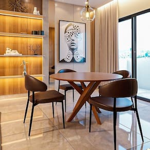 Transforme o ambiente da sua sala de jantar com o conjunto Mesa Lisboa e Cadeiras Bless. A Mesa Lisboa traz um design elegante e funcional, perfeito para criar momentos especiais com amigos e familiares, adicionando um toque de sofisticação ao seu espaço. Seu estilo versátil permite combinar com diferentes estilos de decoração, do tradicional ao contemporâneo. As Cadeiras Bless completam o conjunto com uma combinação de elegância e modernidade. Com encosto anatômico que proporciona conforto e suporte, essas cadeiras são projetadas para se adaptar a diferentes ambientes, seja na sala de jantar, em restaurantes ou até em escritórios. A estrutura em aço confere durabilidade e resistência, enquanto a estofagem de tecidos e couro ecológico de alta qualidade oferece um toque macio e sofisticado. Possui Portas: Não Altura do Conjunto: 78 cm Ambiente: null Ambiente Principal: Sala de Jantar codigo_ean: 7900288018281 Cor: Marrom/Whisky Cor do Produto: Marrom/Whisky Informação Complementar: 1x Mesa de Jantar Redonda Madeira Maciça 4 Lugares 120cm Lisboa Nozes Largura: 120 cm Altura: 73 cm Peso: 16 kg Profundidade: 120 cm Necessita Montagem: Sim