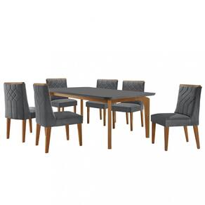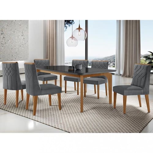 Características: Estrutura em MDF Tampo com vidro temperado Vidro 4mm 6 Cadeiras Cada cadeira suporta até 120 kg Revestimento com tecido linho
