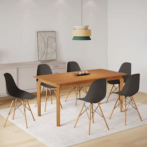 Mesas e cadeiras são indispensáveis para o bom funcionamento de uma casa, sendo ideais para cozinhas ou salas de jantar. As mesas oferecem amplo espaço para dispor pratos, copos, talheres e diversos objetos, sendo de fácil combinação e perfeitas para a sua rotina ou reuniões de convidados. Conheça nossa linha de Cadeiras Eames e apaixone-se por esse modelo que vai transformar o ambiente da sua casa, deixando-o mais moderno, bonito e sofisticado. Inspiradas nos modelos exclusivos de Charles Eames dos anos 50, as Cadeiras Eames com Base de Madeira Natural DSW possuem curvas detalhadamente desenvolvidas para o seu conforto. Ideais para a sala de jantar, essas cadeiras são de altíssima qualidade e foram projetadas com um formato ergonômico para melhor adaptação e experiência dos nossos consumidores. Altura do Conjunto: 82 cm Ambiente: null Ambiente Principal: Sala de Jantar Cor: Preto/Marrom Informação Complementar: 2x Cadeira Base em Madeira e Aço Eames Preto Largura: 46 cm Altura: 82 cm Peso: 3,4 kg Profundidade: 52 cm Necessita Montagem: Sim