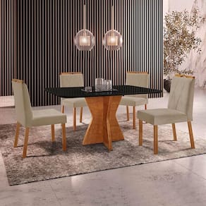 Escala de Brilho: Semi-Brilho Cor Predominante: Mel Encosto e Assento Estofados, Revestidos em Veludo ou Linho Enchimento do Assento: Espuma D-20 Medida da Mesa (A x L x P): 78 X 140 X 80 cm Medida da Base (A x L x P): 75 X 63 X 98 cm Medida do Tampo (L x C x E): 84 X 144 X 2,1 cm Medida da Cadeira/Banco (A x L x P): 94 X 46 X 55 cm Material da Base da Mesa: MDF Peso da Cadeira: 8,5 Kg Cadeira Suporta Até 120 Kg Acabamento da Cadeira: Verniz Natural Material da Estrutura da Cadeira: MDF/Madeira Maciça Cor do Tampo: Preto Cor da Base: Mel Enchimento do Encosto: Espuma D-14 Almofada do Assento: Fixa Estrutura do Assento: MDF 6mm/Espuma 40mm Peso da Mesa: 29,5 Kg Acabamento da Mesa: Verniz Natural Mesa Suporta Até 30 Kg Formato do Tampo: Retângular Material do Tampo: Vidro 3mm/MDF 18mm