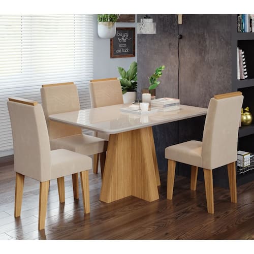 A sala de jantar Maitê tem dimensões de 1,30x1,80 cm e quatro cadeiras Tais. Você poderia reunir a sua família para um jantar? A Cimol estará presente nesse momento, proporcionando momentos agradáveis e descontraídos! A mesa Maitê possui uma base em forma de cruz, seu tampo é de mdf/vidro com bordas chanfradas e acabamento em laca. As cadeiras Tais C/moldura são uma ótima opção, pois sua estrutura é composta por mdf com pintura U.V. Além disso, o assento e encosto possuem espumas de alta densidade, o que proporciona maior conforto. A Cimol apresenta um design inovador, buscando sempre um design moderno para o seu ambiente.