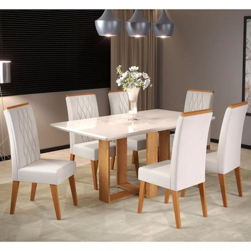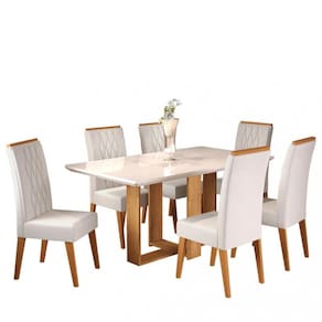 Características: Estrutura da mesa em MDP Tampo retangular em MDF 40mm e vidro 4mm Tampo suporta até 50kg distribuídos 6 Cadeiras Estrutura da cadeira: madeira de Eucalipto Encosto em MDF e espuma D12 Assento em MDF em espuma D20 Cada cadeira suporta até 90kg Revestimento das cadeiras em tecido Veludo Acabamento em pintura UV, semi-brilho
