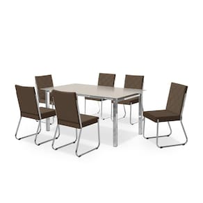 Conjunto com design Clássico porém moderno. Mesa em aço cromado polido de alto brilho, de pés robustos com encaixe perfeito e preciso das travas nos pés da mesa, a sofisticação fica por conta do vidro serigrafado temperado. Cadeiras resistentes e reforçadas, de aço cromado polido de alto brilho, com pés cromados dando um toque de sofisticação a cadeira, assentos e encostos tapeçados com costura no encosto dando um toque de sofisticação e modernidade. Produtos de montagem fácil e funcional. Medida da Mesa (A x L x P): 77x90x160 cm Peso da Mesa: 49 kg Mesa suporta até: 35.0000 Acabamento da Cadeira/Banco: Cromado Acabamento da Mesa: Cromado Almofada do assento: Fixa Altura do Conjunto: 90 Ambiente Principal: Sala de Jantar Cadeira/Banco estofada: Sim Cadeira/Banco suporta até: 100.0000 codigo_ean: 7909903350720 Complexidade da Montagem: Baixa: pode ser montado por uma pessoa sozinha Cor: Cromado/Marrom Cor do Produto: Cromado/Marrom Enchimento do Assento: Espuma D-23 Enchimento do Encosto: Espuma D-16 Escala de Brilho: Brilhante Espessura do Tampo: 6 mm Estrutura do Assento: MDF Itens Inclusos: 1 Mesa, 6 Cadeiras, Kit Ferragens e Manual de Montagem Linha ou Coleção: Ortencia/Deise Manual de Montagem e Instalação: https://product-hub-prd.madeiramadeira.com.br/853156/documents/a6c62ea0-ec28-4974-8555-f6560e1469c1asdeisenewmesaonixortencia.pdf Material da Base da Mesa: Aço Material da Estrutura da Cadeira: Aço Carbono Material do Tampo: Vidro Medida da Base (A x L x P): 77x90x160 cm Medida da Cadeira/Banco (A x L x P): 92x47x53 cm Medida do Tampo (L x C x E): 90x160x6 cm Necessita Montagem: Sim Origem do Produto: Nacional Peso da Cadeira/Banco: 5 kg Possui Apoio para Braços: Não Possui Apoio Para os Pés: Não Possui Suporte Giratório: Não Quantidade de Cadeiras: 6 Quantidade de Lugares: 06 Recomendações de Uso, Manutenção e Limpeza: Limpeza com pano macio e levemente umedecido. Não ultilizar solventes a base e de inflamáveis. Não utilizar produtos abrasivos. Revestimento da Cadeira/Banco: Suede Sistema de Montagem: Parafusos Vidro Temperado: Sim Ean: 7909903350720