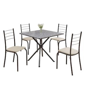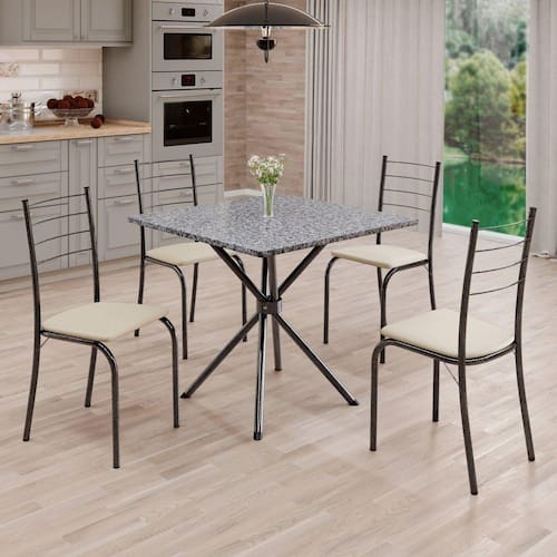 Conjunto Sala de Jantar Mesa Quadrada 70x70cm Tampo Granito Ocre 4 Cadeiras Rio Creme / Mart Prata