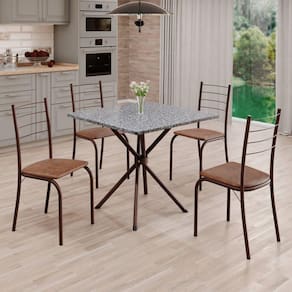 O Conjunto Sala de Jantar Rio é uma ótima escolha para quem busca combinar estilo e praticidade. Este conjunto apresenta uma mesa quadrada com um design elegante e moderno, acompanhada por quatro cadeiras. A mesa tem uma estrutura em aço, que oferece estabilidade ao conjunto. O tampo em pedra granito ocre apresenta uma estética sofisticada e acolhedora. A tonalidade ocre adiciona calor e elegância ao ambiente, enquanto a pedra granito oferece durabilidade e resistência a riscos e manchas. Essa combinação de cores naturais e resistência prática resulta em um visual clássico e funcional, tornando o tampo em pedra granito ocre uma ótima escolha para aprimorar sua sala de jantar. Medida da Mesa (A x L x P): 75 cm x 70 cm x 70 cm Peso da Mesa: 28,7 kg Mesa suporta até: 15 kg Acabamento da Cadeira/Banco: Pintura Texturizada Acabamento da Mesa: Pintura Texturizada Ambiente Principal: Sala de Jantar Cadeira/Banco estofada: Somente Assento Estofado Cadeira/Banco suporta até: 120 kg Complexidade da Montagem: Média: pode ser montado por mais de uma pessoa e/ou necessite de maior conhecimento para montagem Cor: Marrom Cor do Produto: Marrom Cor Secundária: Marrom De Canto (Canto Alemão): Não Escala de Brilho: Semi-Fosco Espessura do Tampo: 18 mm Estrutura do Assento: MDP de 15mm, espuma 1,2mm, courino. Formato do Tampo: Quadrado Itens Inclusos: 1 Mesa, 4 Cadeiras, Manual de Montagem e Ferragens Manual de Montagem e Instalação: https://product-hub-prd.madeiramadeira.com.br/898494/documents/ec6f9cc8-8bb7-45df-be86-5d8fa64800bd1847485manualdemontagem.pdf Material da Base da Mesa: Aço Material da Estrutura da Cadeira: Aço Material do Tampo: Granito Medida da Base (A x L x P): 73,2 cm x 46 cm x 46 cm Medida da Cadeira/Banco (A x L x P): 84,5 cm x 37,5 cm x 41,5 cm Medida do Tampo (L x C x E): 70 cm x 70 cm x 1,8 cm Mesa Extensível: Não Necessita Montagem: Sim Origem do Produto: Nacional Peso da Cadeira/Banco: 2,48 kg Possui Apoio Para os Pés: Não Quantidade de Cadeiras: 4 Quantidade de Lugares: 04 Recomendações de Uso, Manutenção e Limpeza: Limpe a superfície usando um pano úmido com a solução(75%água + 15%detergente neutro), torça para retirar o excesso e, em seguida, finalize com um pano limpo e seco. Sistema de Montagem: Parafusos