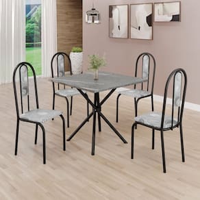Este conjunto de mesa quadrada e 4 cadeiras oferece estilo e praticidade. Com estrutura tubular em aço para estabilidade, o tampo em pedra granito adiciona sofisticação e resistência a riscos e manchas. As cadeiras combinam harmoniosamente com a mesa, garantindo conforto com estofamento. Ideal para diversos espaços, é perfeito para receber convidados ou desfrutar de refeições em família, criando um ambiente acolhedor e elegante. Medida da Mesa (A x L x P): 75,3 cm x 70 cm x 70 cm Peso da Mesa: 27.92 Mesa suporta até: 15 Acabamento da Cadeira/Banco: Pintura Texturizada Acabamento da Mesa: Pintura Texturizada Ambiente Principal: Sala de Jantar Cadeira/Banco estofada: Encosto e Assento Estofados Cadeira/Banco suporta até: 120 kg Complexidade da Montagem: Média: pode ser montado por mais de uma pessoa e/ou necessite de maior conhecimento para montagem Cor: Paraopeba/ Preto Fosco Cor do Produto: Paraopeba/ Preto Fosco Cor Secundária: Cinza De Canto (Canto Alemão): Não Enchimento do Assento: Espuma D-12 Escala de Brilho: Semi-Fosco Espessura do Tampo: 18 Estrutura do Assento: MDP de 15mm, espuma 1,2mm, courino. Formato do Tampo: Quadrado Itens Inclusos: 1 Mesa, 4 Cadeiras, Manual de Montagem e Ferragens. Manual de Montagem e Instalação: https://product-hub-prd.madeiramadeira.com.br/905587/documents/4689e4a8-3f55-47c3-adaa-ec0cad0d217a194394952461715364274847.pdf Material da Base da Mesa: Aço Material da Estrutura da Cadeira: Aço Material do Tampo: Granito Medida da Cadeira/Banco (A x L x P): 92X cm x 37,5X cm x 45,5X cm Medida do Tampo (L x C x E): 70 cm x 70 cm x 1,8 cm Mesa Extensível: Não Necessita Montagem: Sim Origem do Produto: Nacional Peso da Cadeira/Banco: 3,36 kg Possui Apoio Para os Pés: Não Quantidade de Lugares: 04 Recomendações de Uso, Manutenção e Limpeza: Usar um pano de tecido macio e seco, evitar detergentes, alvejantes e produtos químicos de limpeza; no tampo usar tecido macio levemente umedecido. Revestimento da Cadeira/Banco: Courino Sistema de Montagem: PARAFUSOS