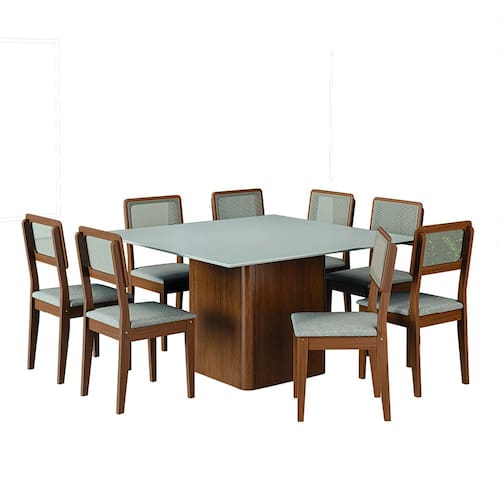 MEDIDAS: Medidas Mesa: [ A ] = 80 cm [ L ] = 136 cm [ P ] = 136 cm Medidas Cadeiras (cada): [ A ] = 92 cm [ L ] = 46 cm [ P ] = 40 cm PESO MESA: 49 Kg PESO CADEIRA: 6,60 Kg (Cada) PESO SUPORTADO MESA: 30 Kg (Distribuídos) PESO SUPORTADO CADEIRA: 110 Kg cada MODELO: Conjunto de Mesa Quadrada Montevideo Sala de Jantar 1,36m com 8 Cadeiras Santiago MARCA: Dobuê COR DA MESA: Estrutura: Madeirado / Tampo: Off White COR DA CADEIRA: Estrutura: Madeirado / Assento: Off White ESTRUTURA: MDF ACABAMENTO MESA: Pintura UV ACABAMENTO CADEIRA: Veluplus TECIDO DA CADEIRA: Linho REVESTIMENTO ASSENTO DA CADEIRA: Espuma D20 MATERIAL DO TAMPO: MDF PÉS DA CADEIRA: Sapatas Plásticas DIFERENCIAL: Material em MDF de alta resistência, cadeiras com encosto em tela. SISTEMA DE MONTAGEM: Parafusos e porcas cilíndricas ITENS INCLUSOS: 1 Mesa e 8 cadeiras, 1 manual de montagem e 1 kit parafusos INSTRUÇÕES E CUIDADOS: Limpar com pano levemente umedecido com água, não utilizar produtos abrasivos GARANTIA: 3 meses pelo fabricante